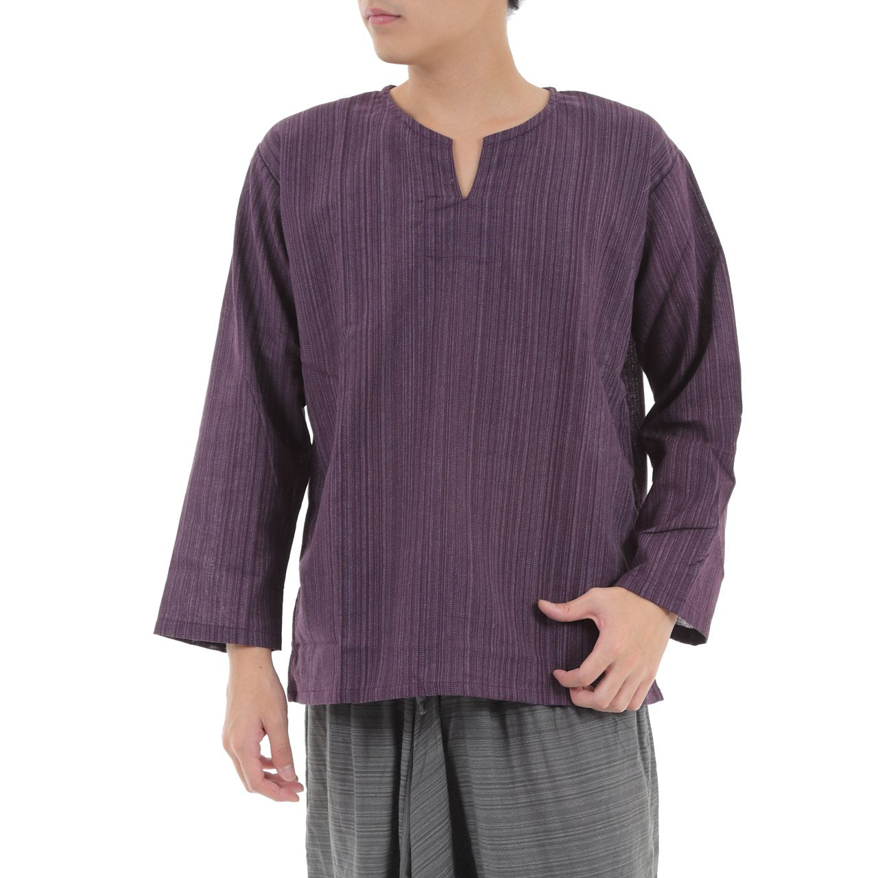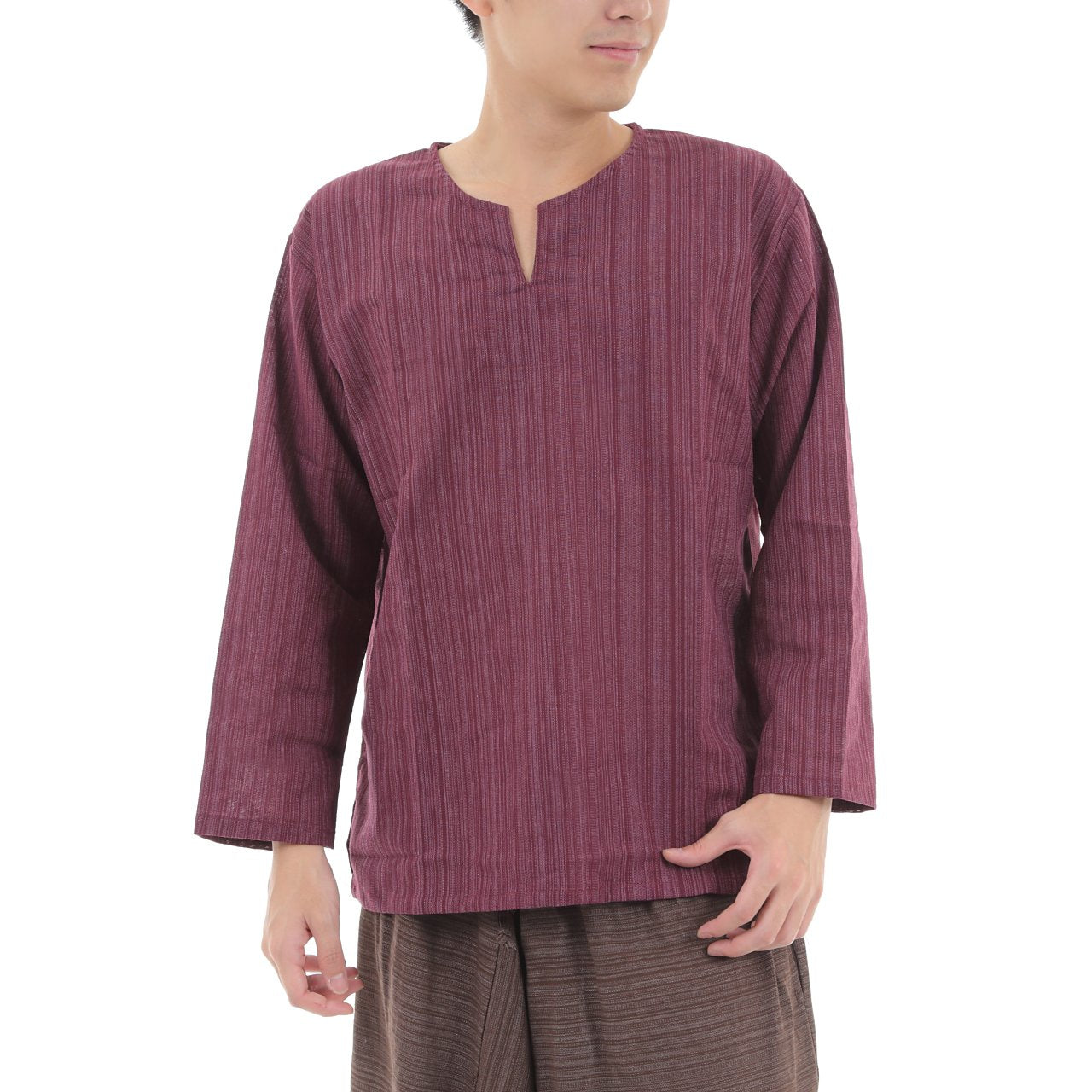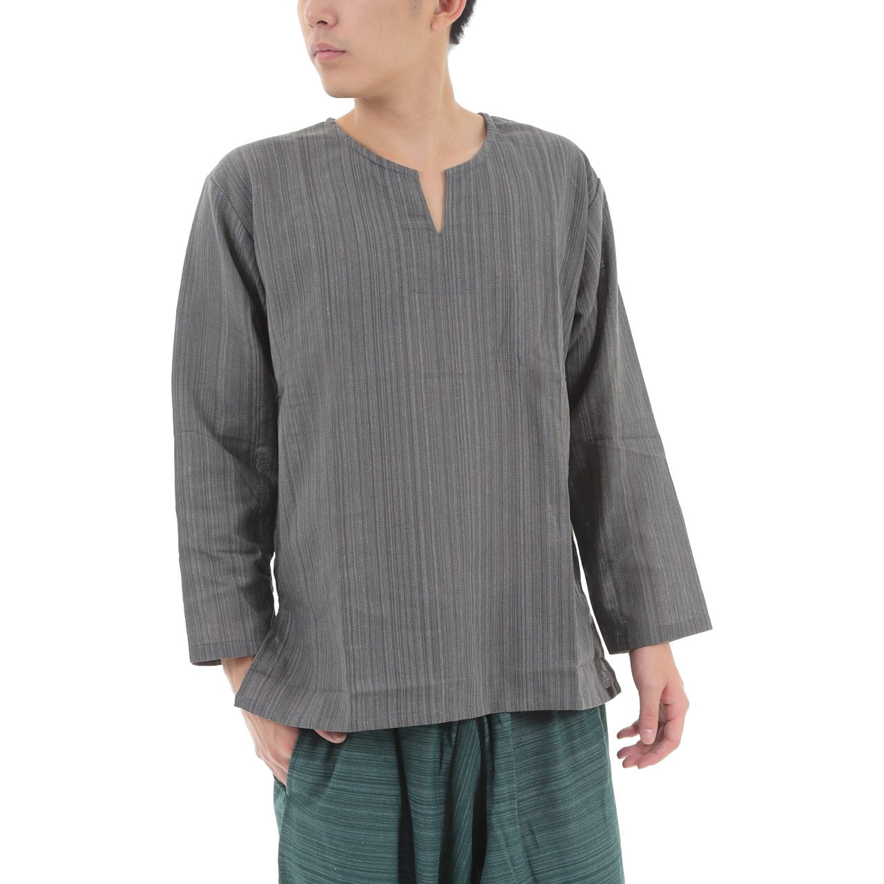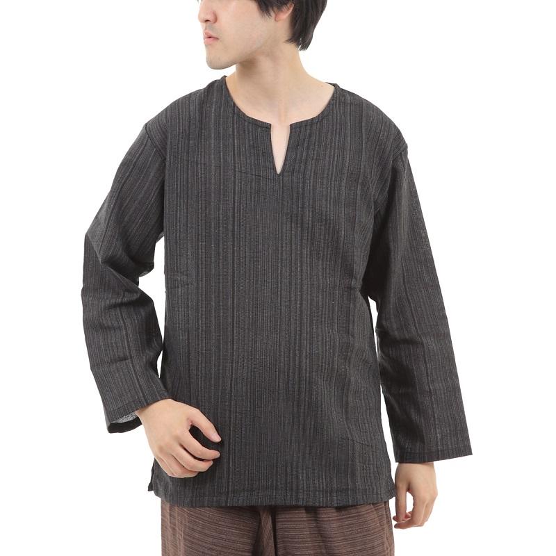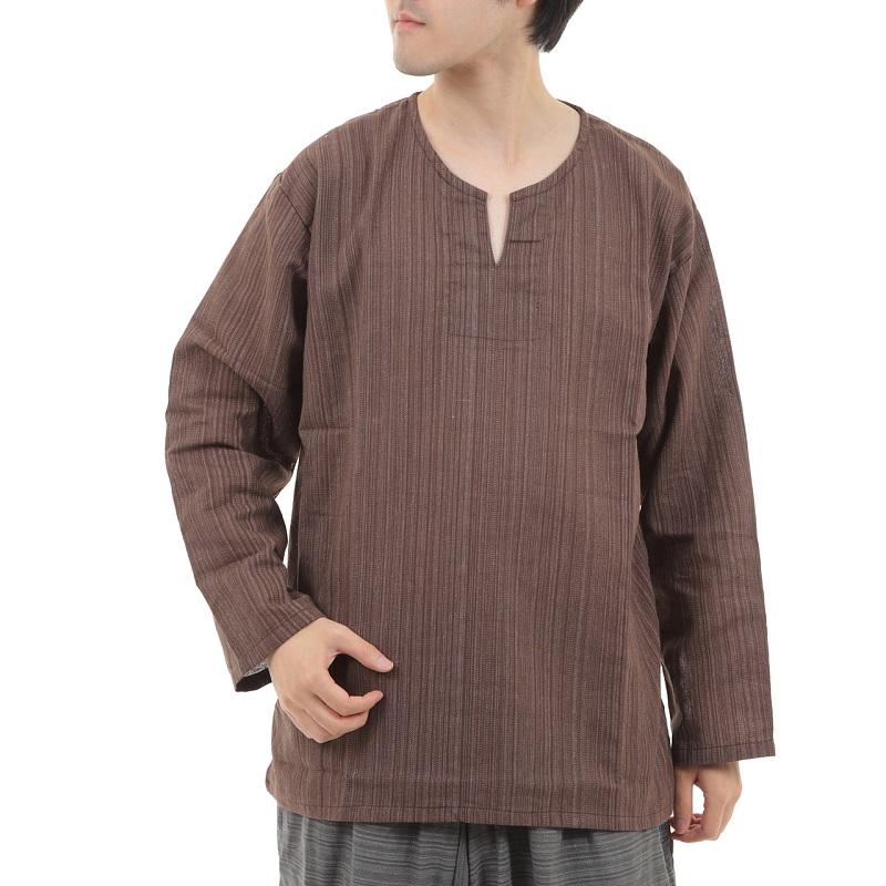 エスニック シャツ ストライプ 長袖 ロング丈 秋冬用 メンズ レディース ユニセックス キーネック アジアン M