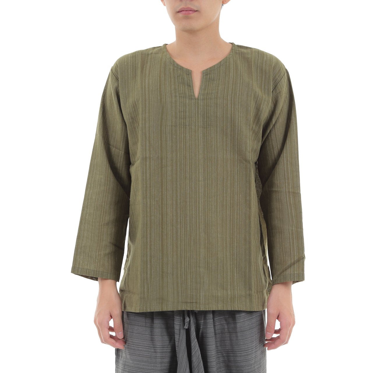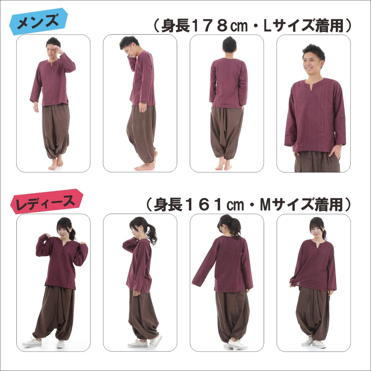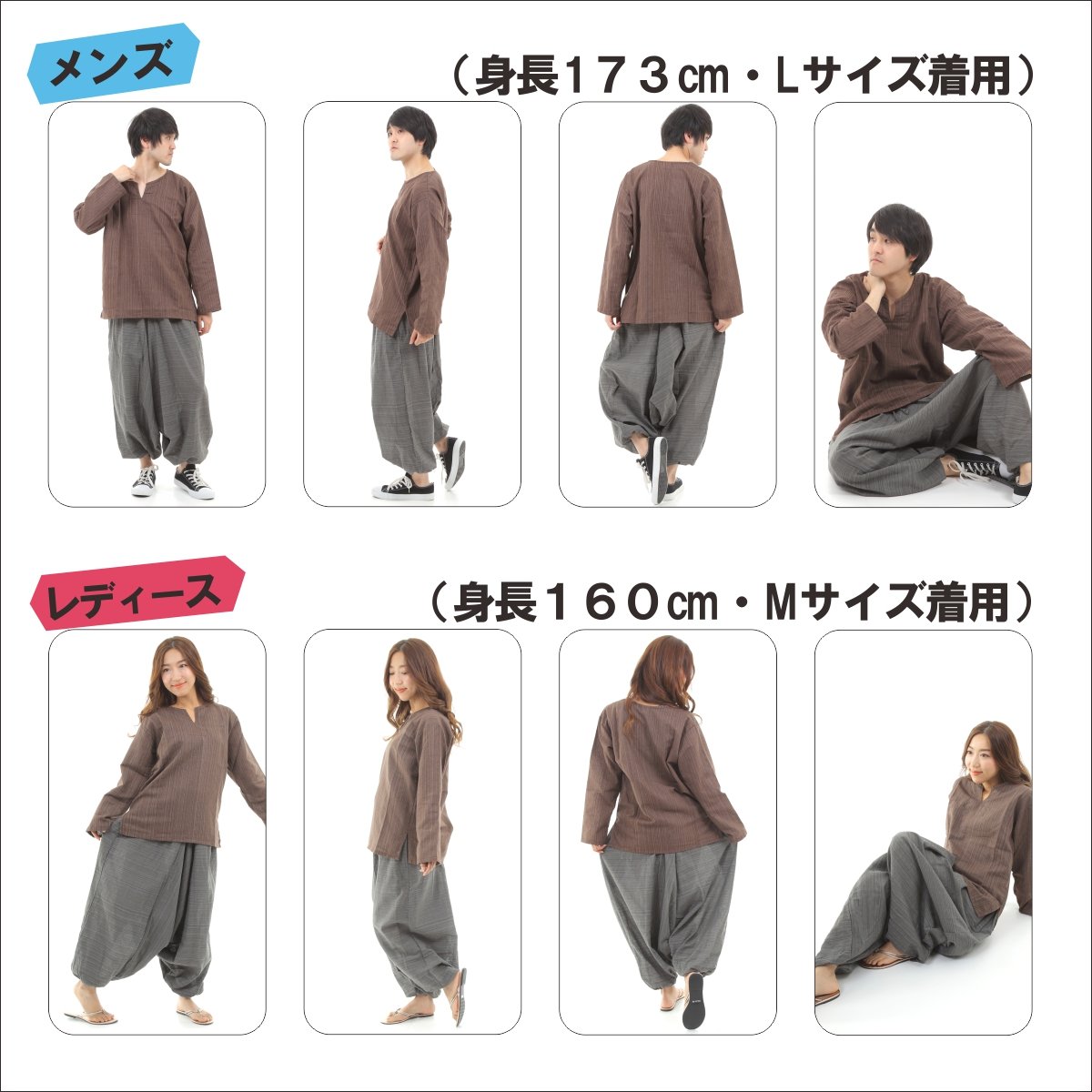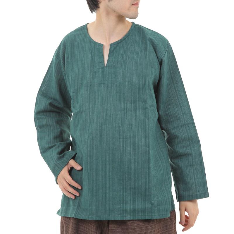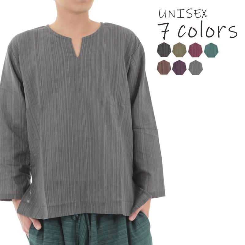 エスニック シャツ ストライプ 長袖 ロング丈 秋冬用 メンズ レディース ユニセックス キーネック アジアン M