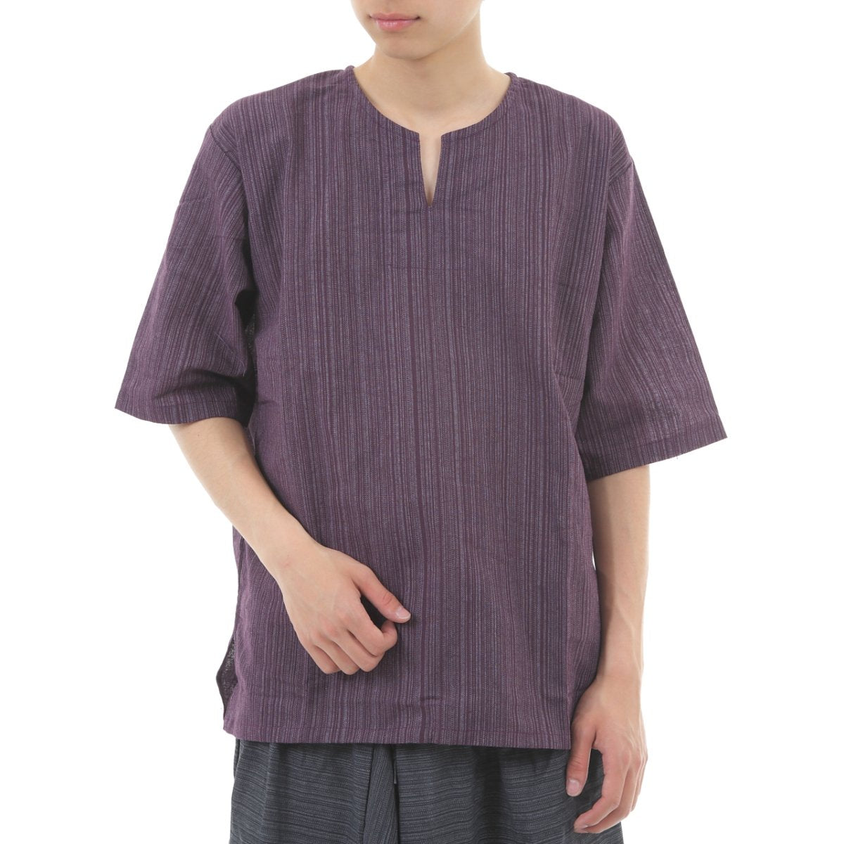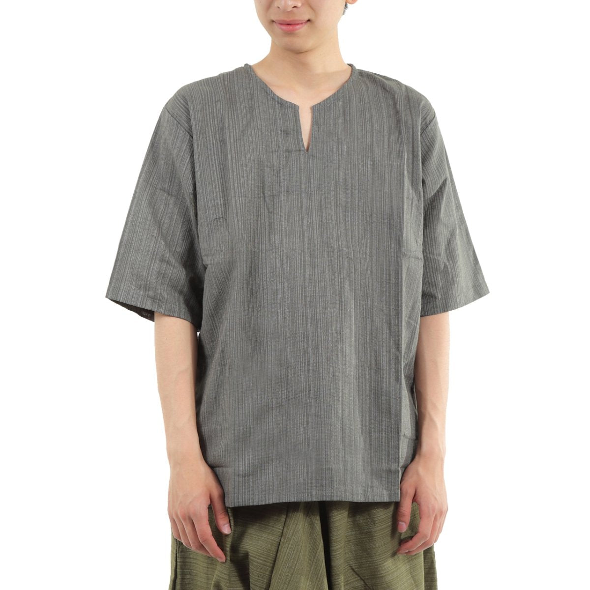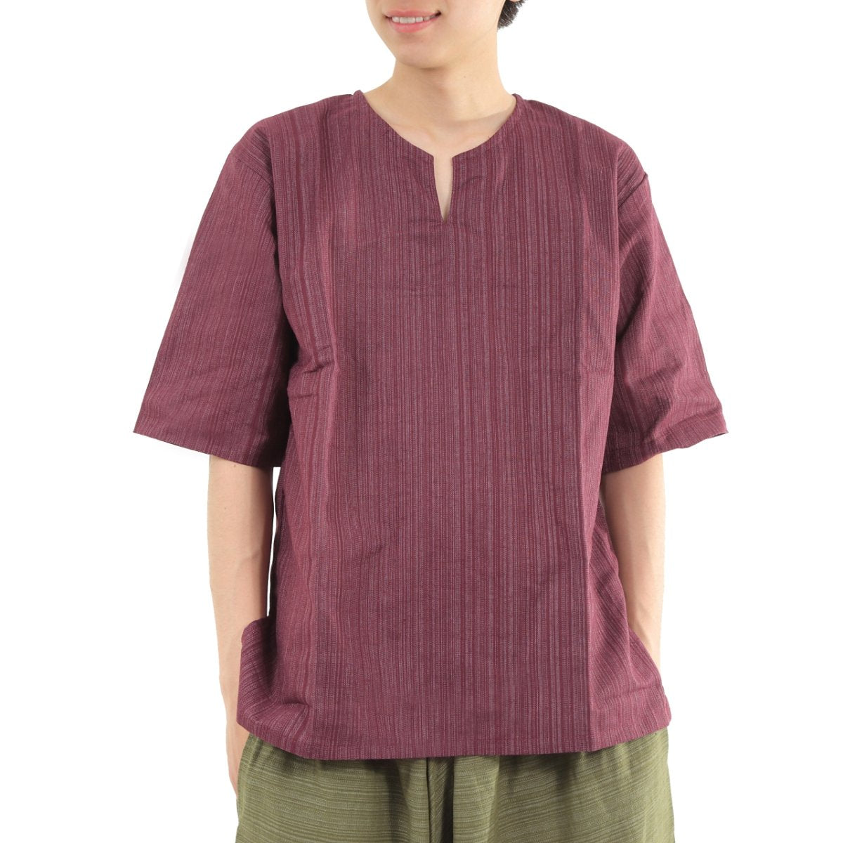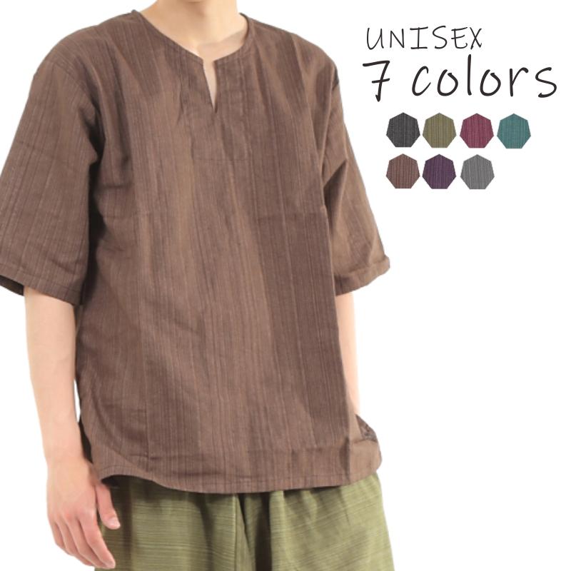 タイパンツにぴったり♪ 半袖ストライプシャツ ゆったりめ キーネック エスニック アジアン ボヘミアン タイランド製 シンプルファッション 無地 メンズ レディース ユニセックス