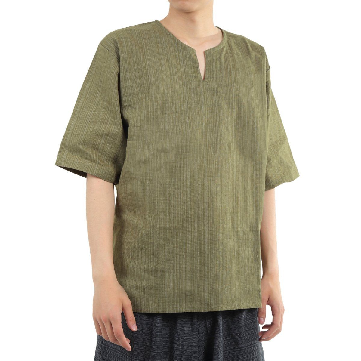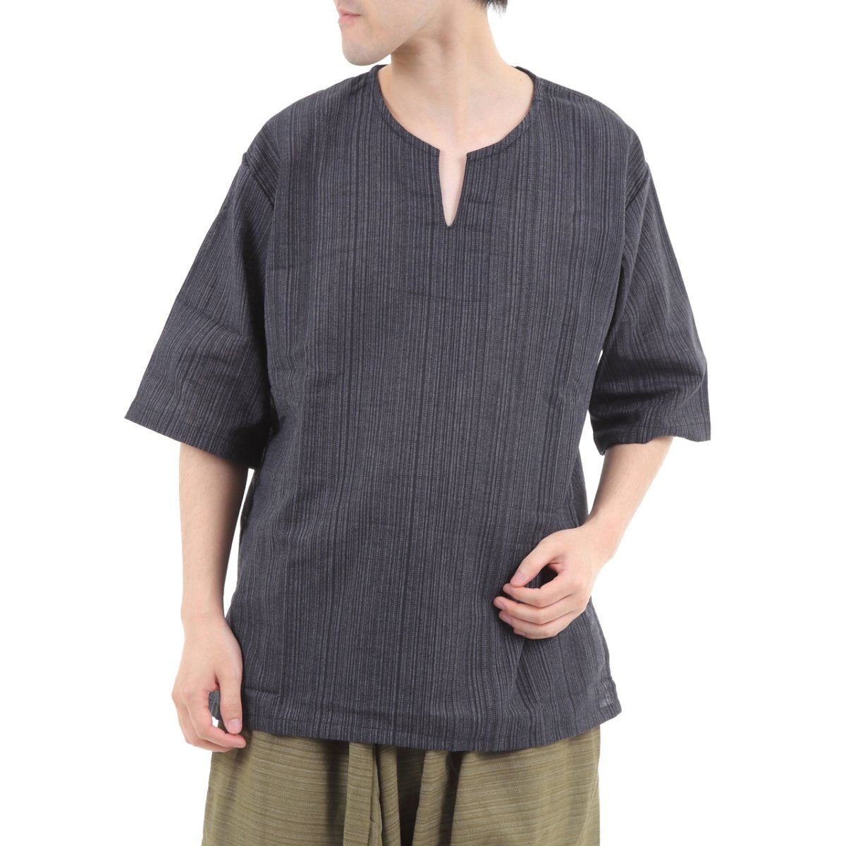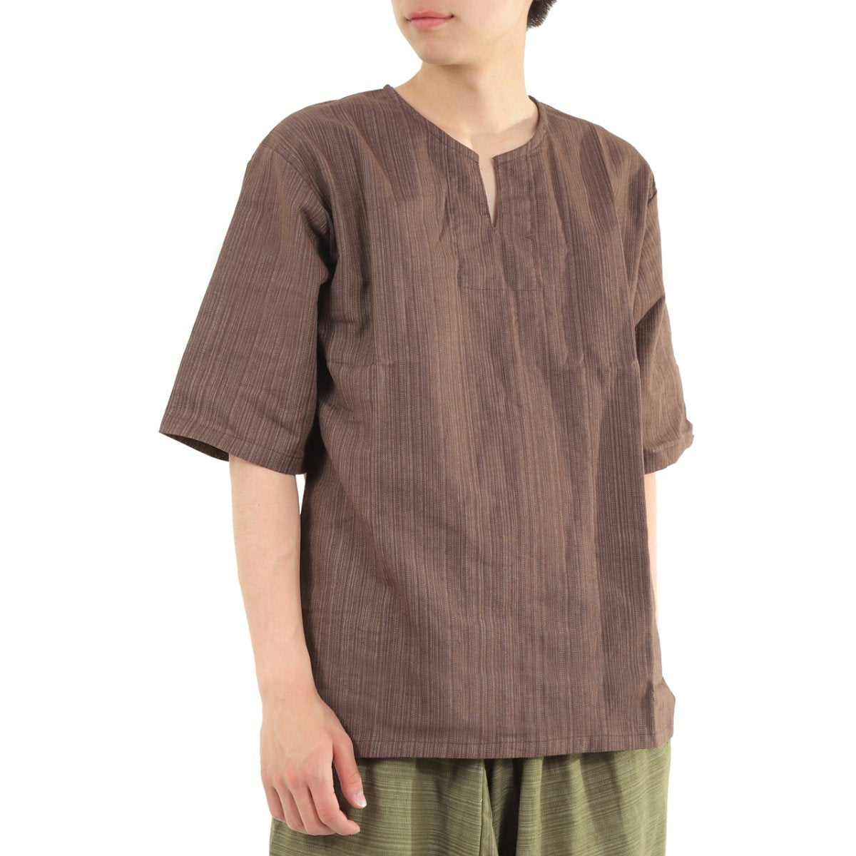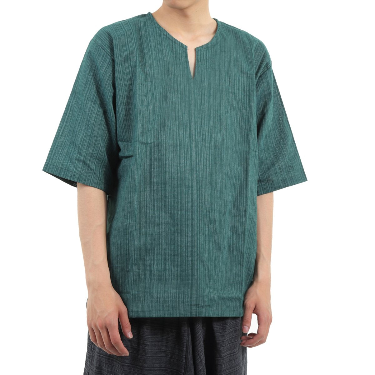 タイパンツにぴったり♪ 半袖ストライプシャツ ゆったりめ キーネック エスニック アジアン ボヘミアン タイランド製 シンプルファッション 無地 メンズ レディース ユニセックス