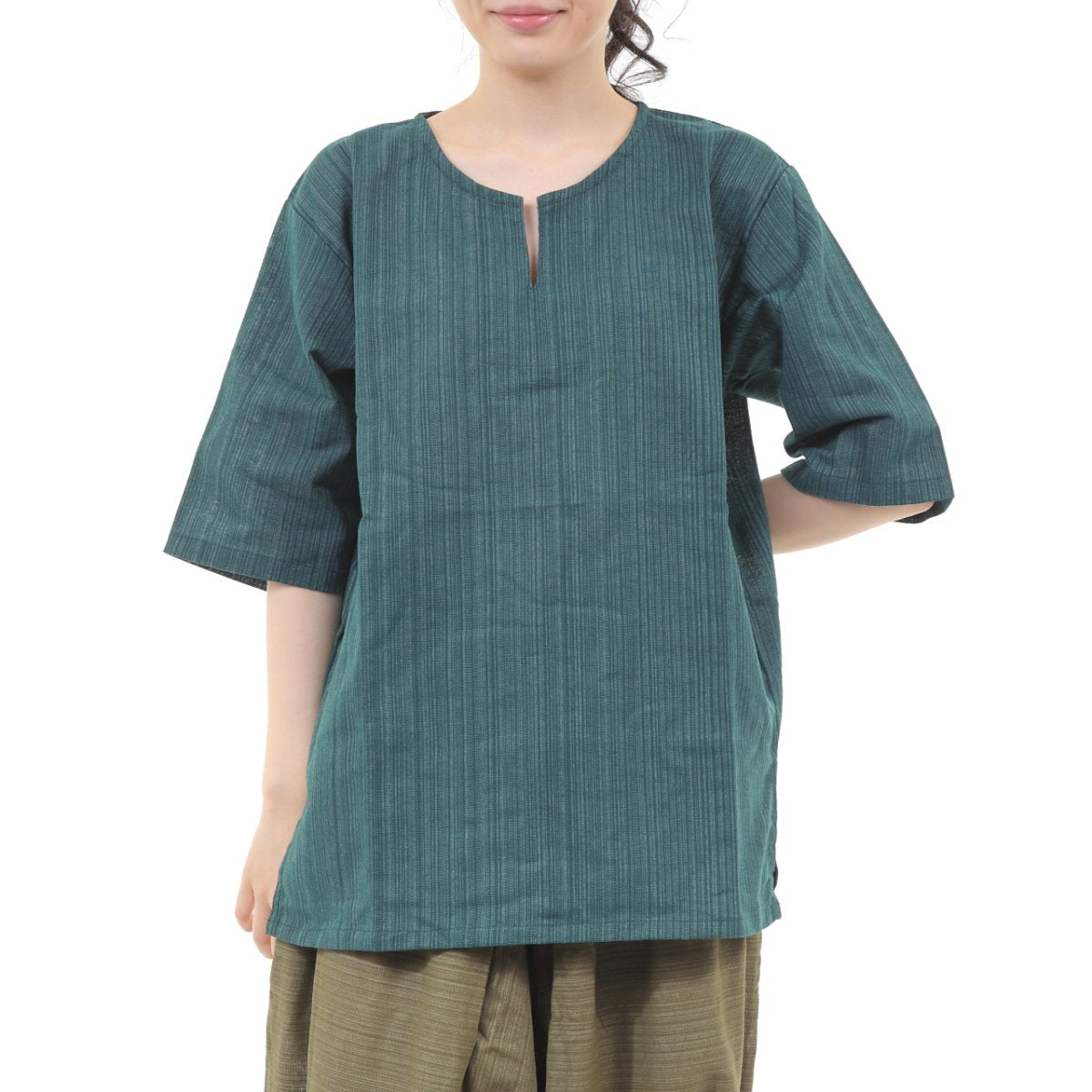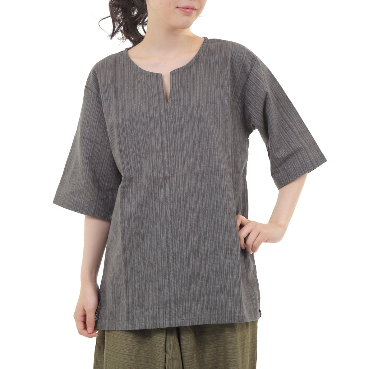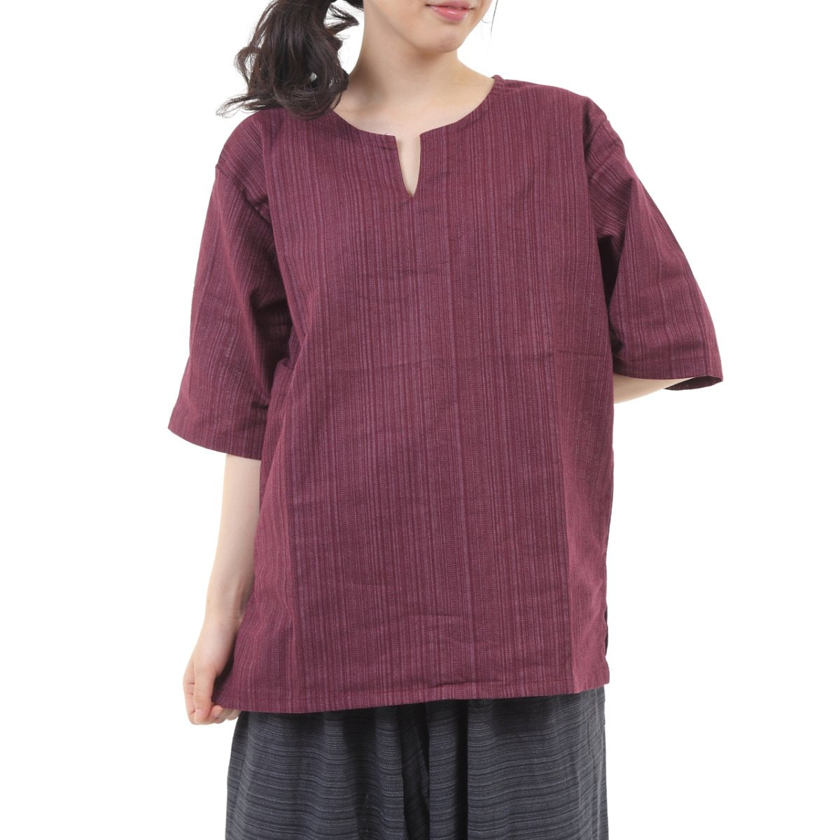 タイパンツにぴったり♪ 半袖ストライプシャツ ゆったりめ キーネック エスニック アジアン ボヘミアン タイランド製 シンプルファッション 無地 メンズ レディース ユニセックス