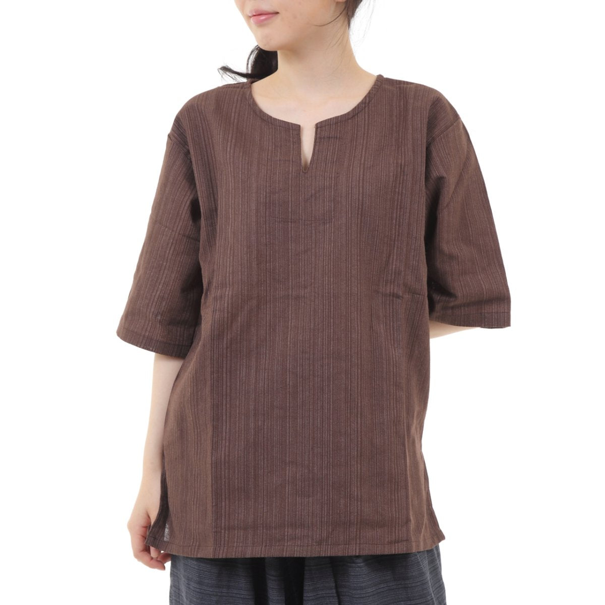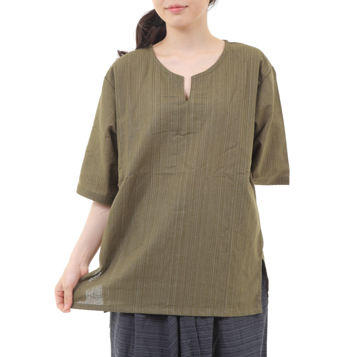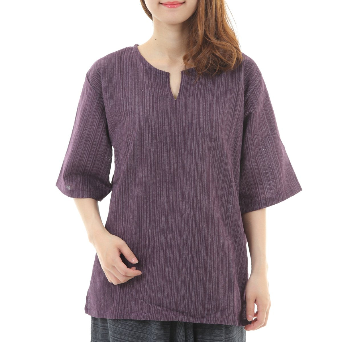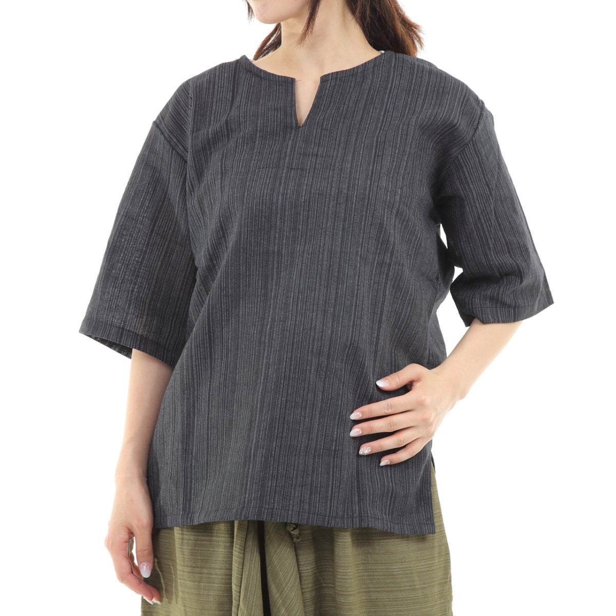 タイパンツにぴったり♪ 半袖ストライプシャツ ゆったりめ キーネック エスニック アジアン ボヘミアン タイランド製 シンプルファッション 無地 メンズ レディース ユニセックス
