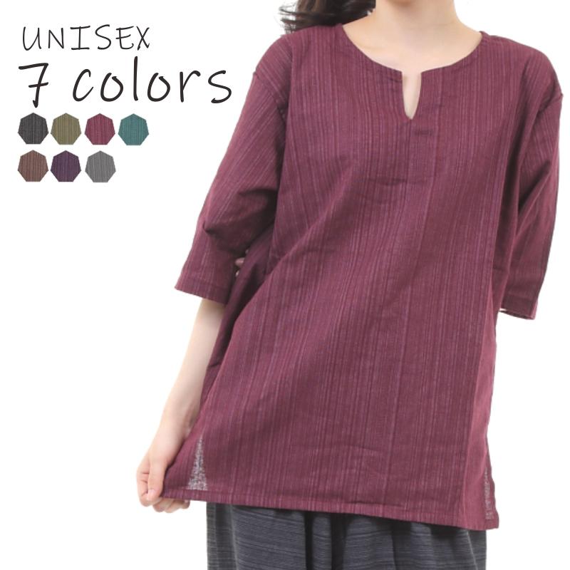 エスニック シャツ ストライプ 5分丈 メンズ レディース ユニセックス キーネック アジアン G