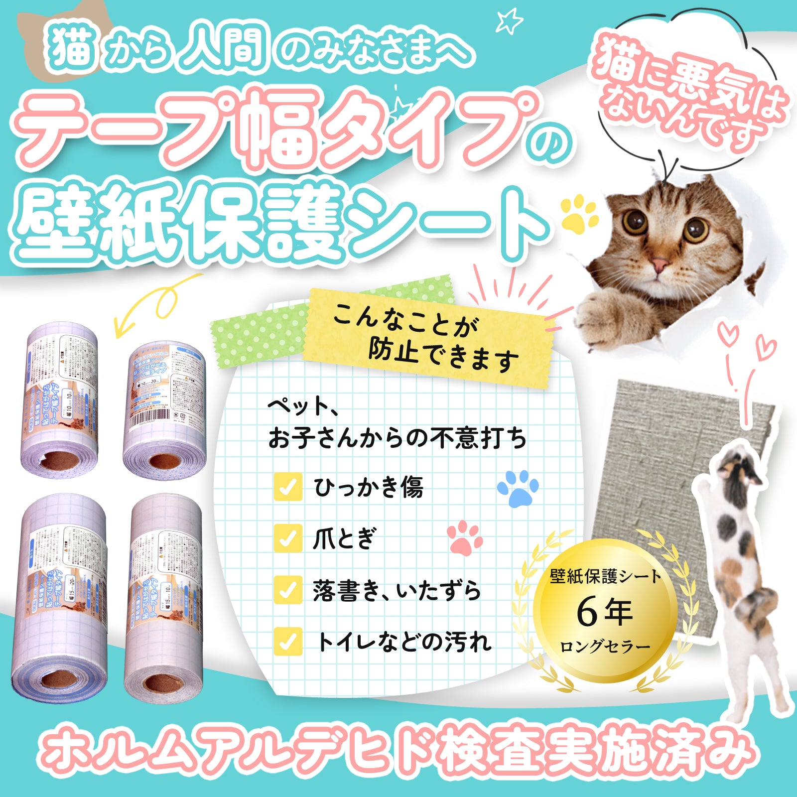 はがせる粘着タイプ:標準 裏紙に1cm方眼マス目入り 貼れる面:ビニール壁紙、プリント合板 ※防汚効果のある壁紙、凹凸のある面や柱、土壁、繊維素材の壁では、粘着効果が弱まり剥がれる場合がありますのでお薦めいたしません。 室内で飼育のペット(猫、犬等)の爪研ぎ(つめとぎ)、つめ傷、いたずらによる壁や柱へのひっかき傷、汚れを防止する対策保護シート その他、お子様の家具へのイタズラ書き、窓ガラス飛散防止養生テープとしてのご利用等にも。 シートの巻き始め等に製造時の裏紙のヨレが発生している場合がございますので、表示の長さにプラスして余長をとってあります。 |