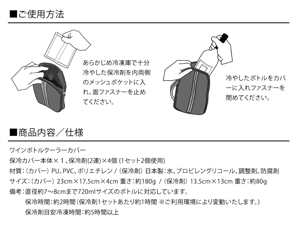 直径約7~8cmまで720mlサイズのボトルに対応しています。 保冷時間:約2時間(保冷剤1セットあたり約1時間 ※ご利用環境により変動いたします。) おしゃれに食卓を彩るワインボトルクーラーカバー |